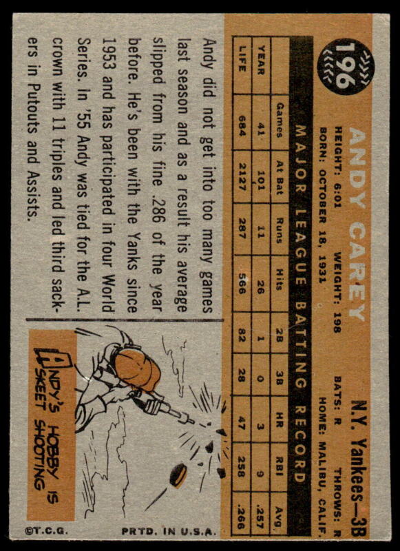 1960 TOPPS ANDY CAREY 196 EXMT BASEBALL NEW YORK YANKEES