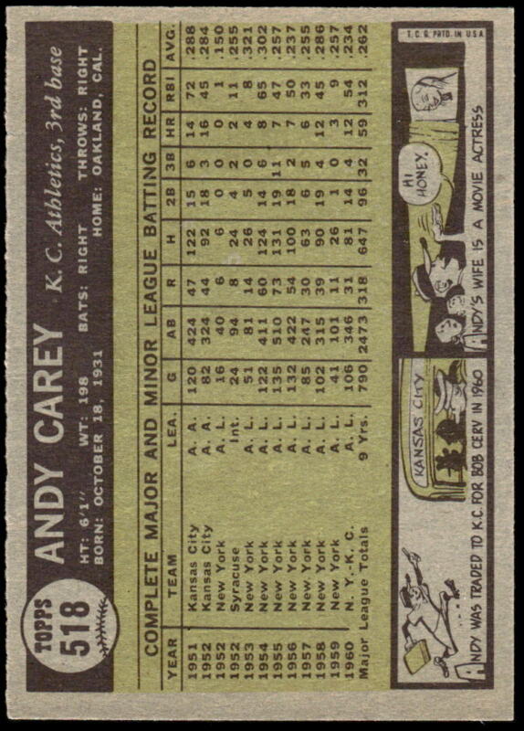 1961 TOPPS ANDY CAREY 518 EXMT BASEBALL KANSAS CITY ATHLETICS