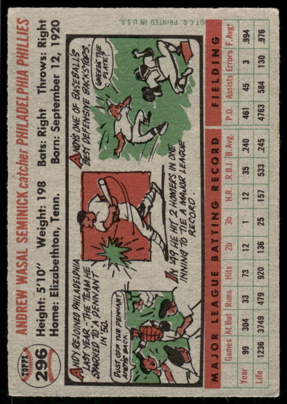 1956 TOPPS ANDY SEMINICK 296 VG-EX BASEBALL PHILADELPHIA PHILLIES