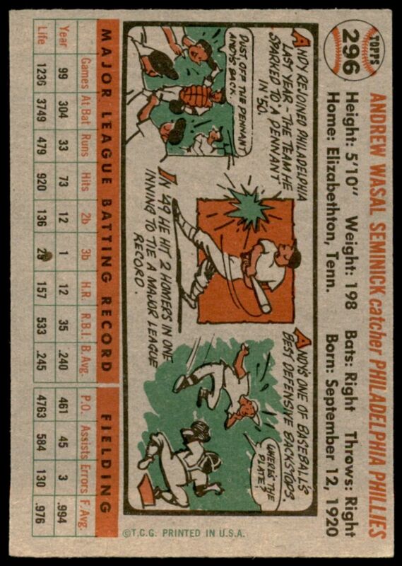 1956 TOPPS ANDY SEMINICK 296 NRMT BASEBALL PHILADELPHIA PHILLIES