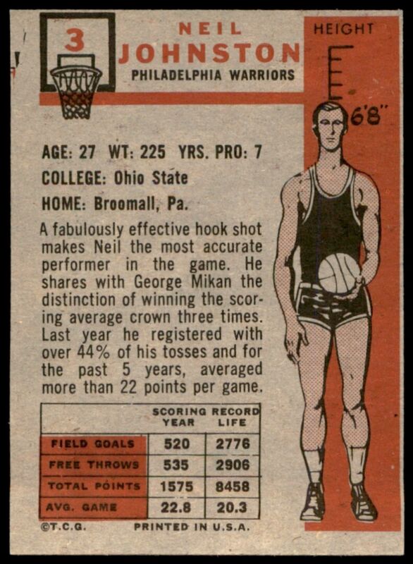 1957 TOPPS NEIL JOHNSTON 3 NRMT OC BASKETBALL PHILADELPHIA WARRIORS