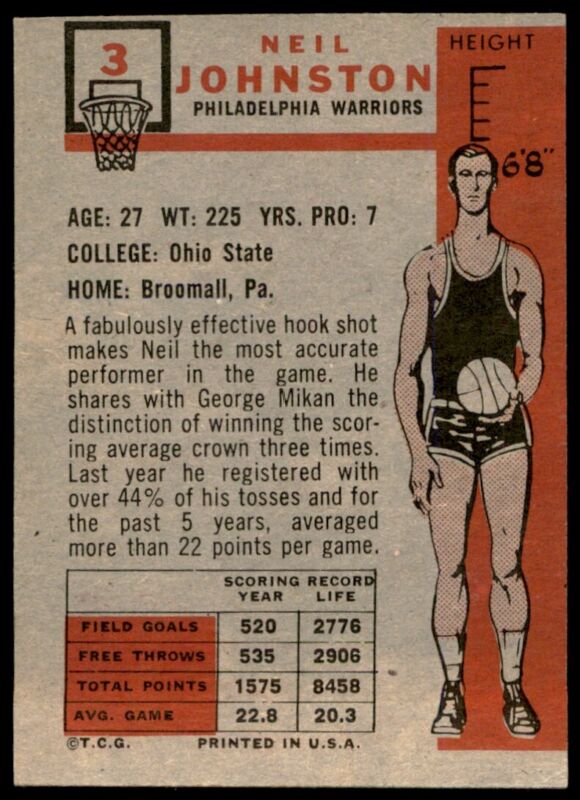 1957 TOPPS NEIL JOHNSTON 3 NRMT OC BASKETBALL PHILADELPHIA WARRIORS