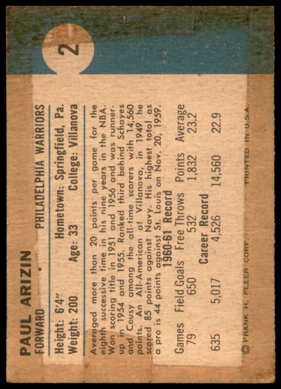 1961 FLEER PAUL ARIZIN 2 FAIR EYE APPEAL BASKETBALL PHILADELPHIA WARRIORS