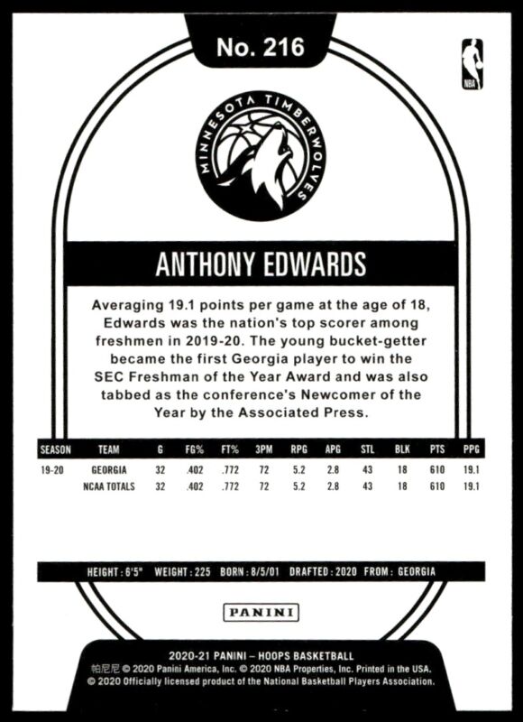 2020 HOOPS ANTHONY EDWARDS 216 MINT RC BASKETBALL MINNESOTA TIMBERWOLVES