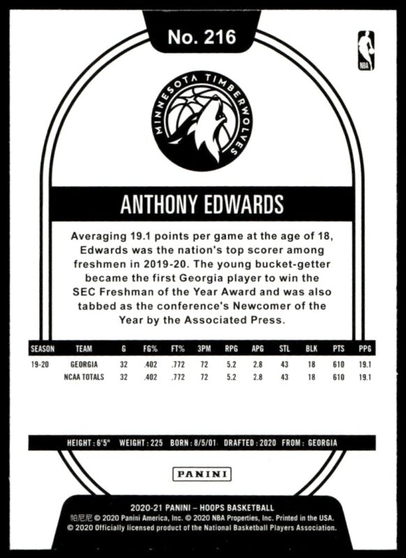 2020 HOOPS ANTHONY EDWARDS 216 MINT RC BASKETBALL MINNESOTA TIMBERWOLVES