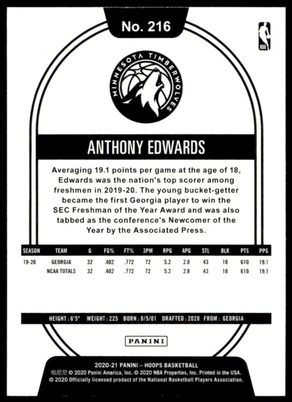 2020 HOOPS ANTHONY EDWARDS 216 MINT RC BASKETBALL MINNESOTA TIMBERWOLVES