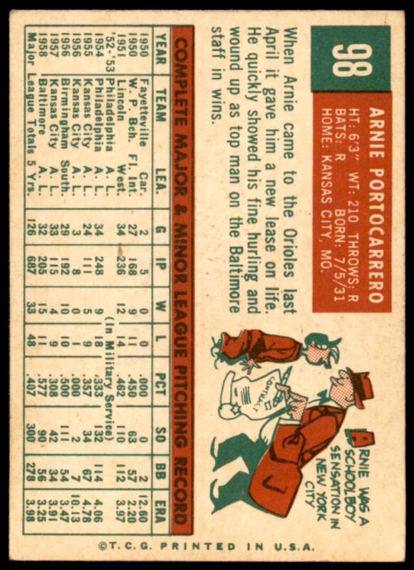1959 TOPPS ARNIE PORTOCARRERO 98 EX BASEBALL BALTIMORE ORIOLES