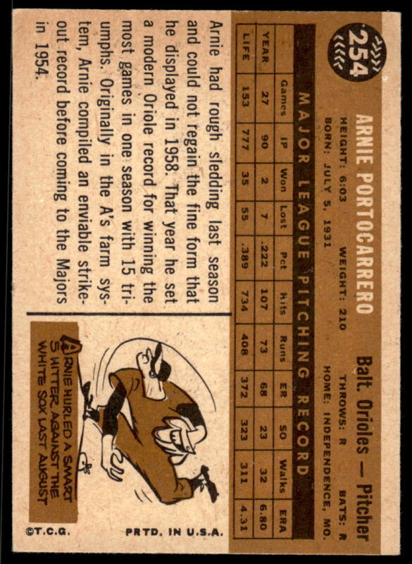 1960 TOPPS ARNIE PORTOCARRERO 254 NRMT BASEBALL BALTIMORE ORIOLES