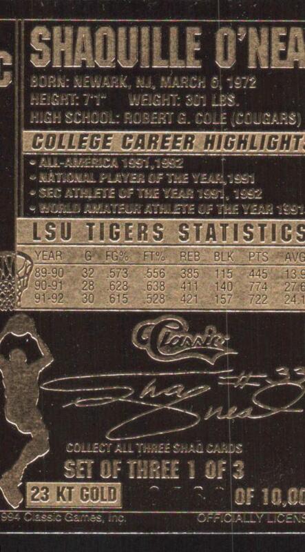 1994 CLASSIC 23K ALL-GOLD SHAQUILLE O'NEAL 1 MINT 563/10000 LSU TIGERS