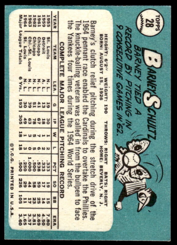 1965 TOPPS BARNEY SCHULTZ 28 EXMT BASEBALL ST. LOUIS CARDINALS