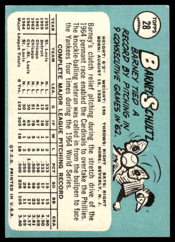 1965 TOPPS BARNEY SCHULTZ 28 EXMT BASEBALL ST. LOUIS CARDINALS