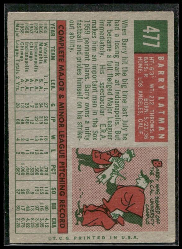 1959 TOPPS BARRY LATMAN 477 VG-EX RC BASEBALL CHICAGO WHITE SOX