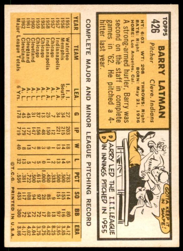 1963 TOPPS BARRY LATMAN 426 EXMT BASEBALL CLEVELAND INDIANS