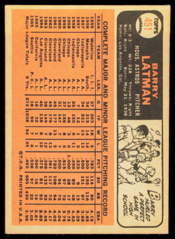 1966 TOPPS BARRY LATMAN 451 VG-EX BASEBALL HOUSTON ASTROS