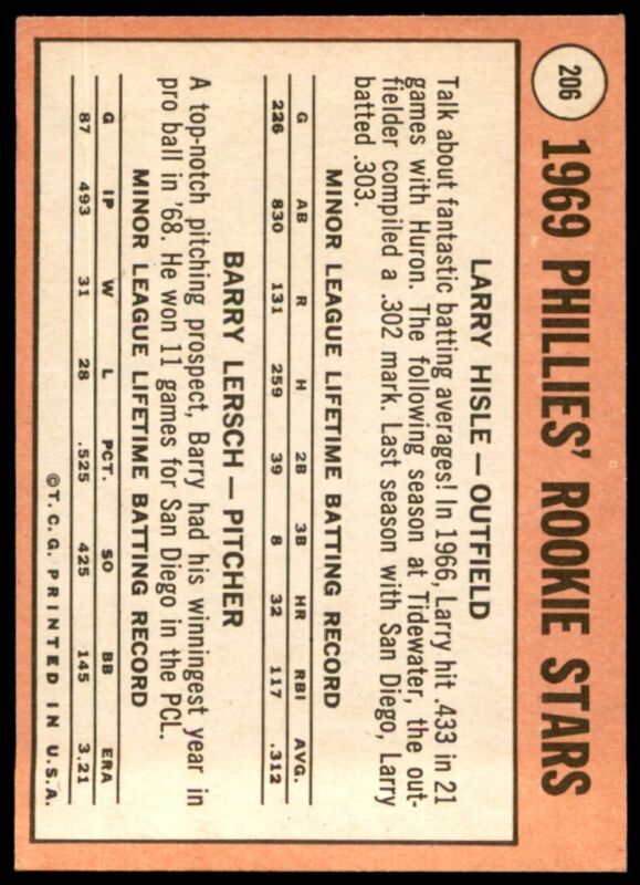 1969 TOPPS BARRY LERSCH 206 EXMT HISLE RC BASEBALL PHILADELPHIA PHILLIES