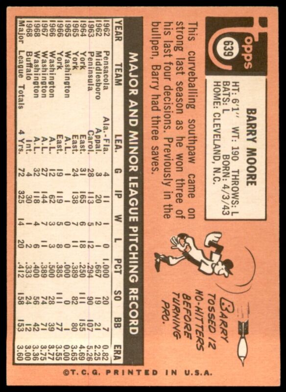 1969 TOPPS BARRY MOORE 639 EXMT BASEBALL WASHINGTON SENATORS