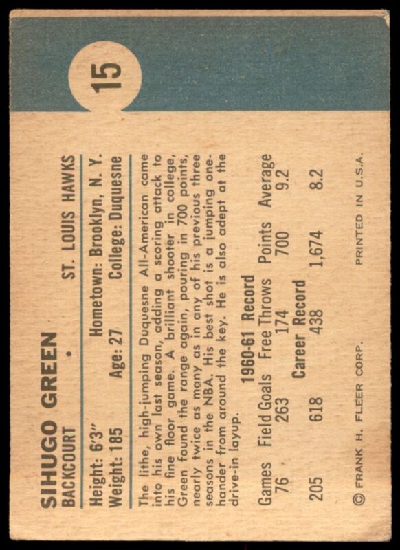 1961 FLEER SIHUGO GREEN 15 GOOD RC BASKETBALL ST. LOUIS HAWKS