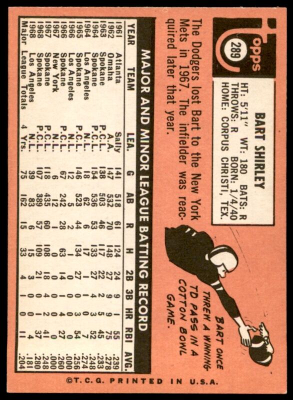 1969 TOPPS BART SHIRLEY 289 EXMT BASEBALL LOS ANGELES DODGERS