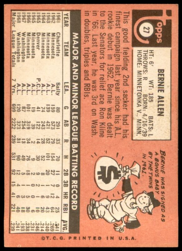 1969 TOPPS BERNIE ALLEN 27 EXMT BASEBALL WASHINGTON SENATORS