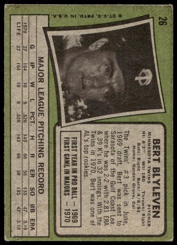 1971 TOPPS BERT BLYLEVEN 26 VG HOF RC BASEBALL MINNESOTA TWINS
