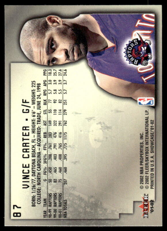 This VINCE CARTER, from the 2001 FLEER SHOWCASE set, is in MINT condition.
