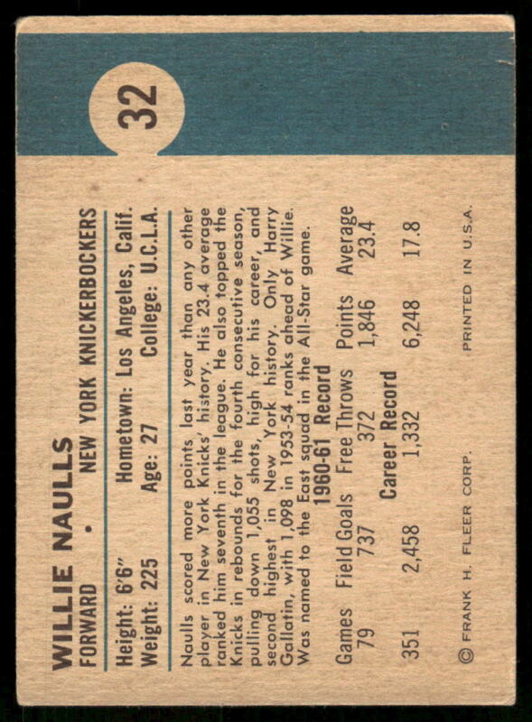 1961 FLEER WILLIE NAULLS 32 VG BASKETBALL NEW YORK KNICKS